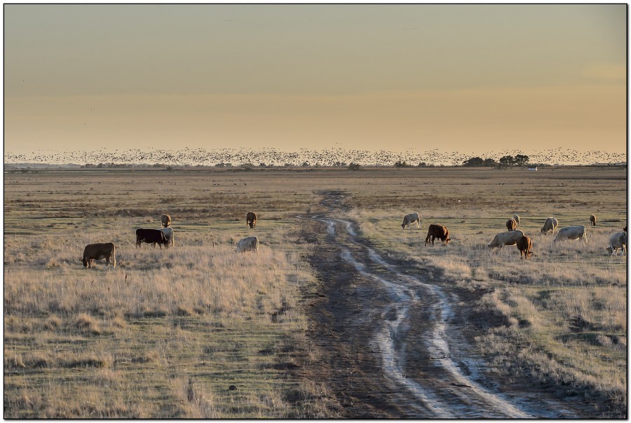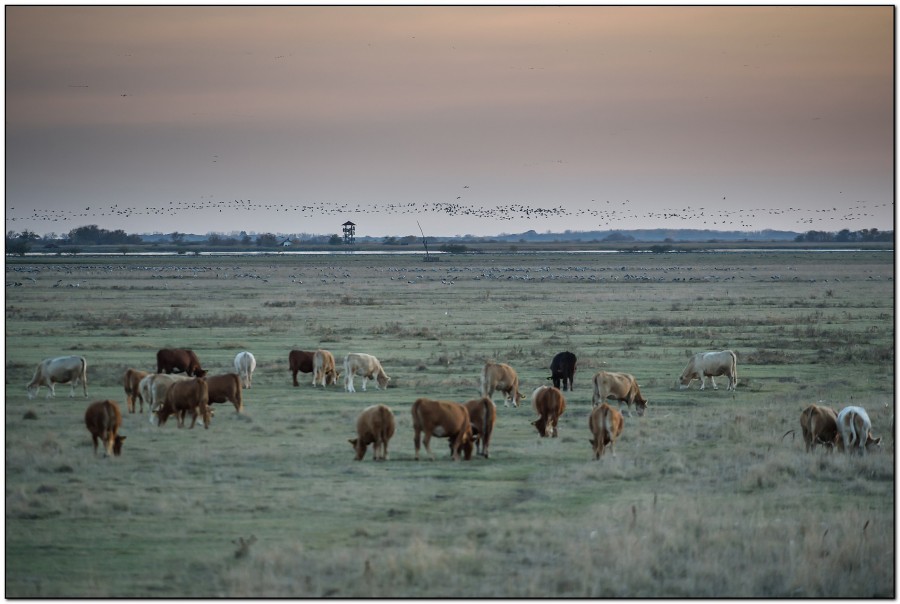 Wszyscy głodni. Z przodu krowy z tyłu żurawie.